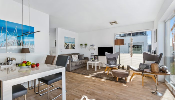 Das hochwertige Interieur im maritimen Design spiegelt die einzigartige Lage dieser Erdgeschosswohnung wieder. Das gesamte Inventar und das Mobiliar sind im Kaufpreis enthalten.