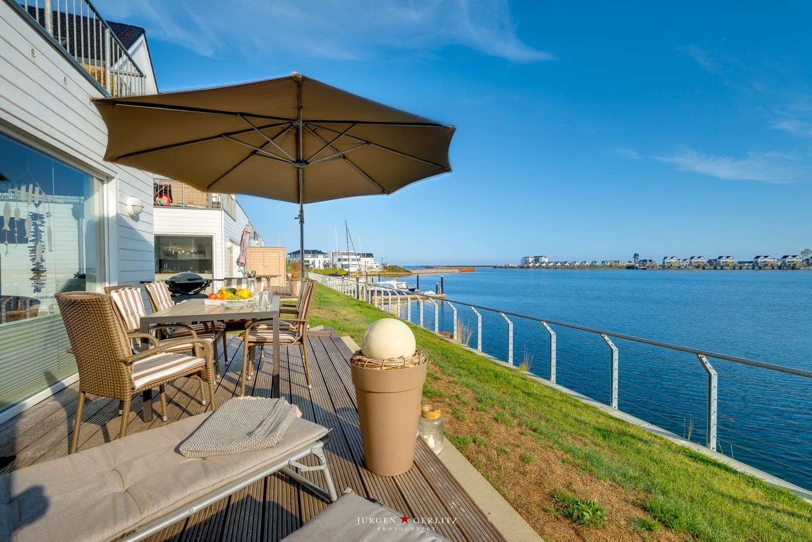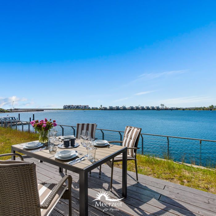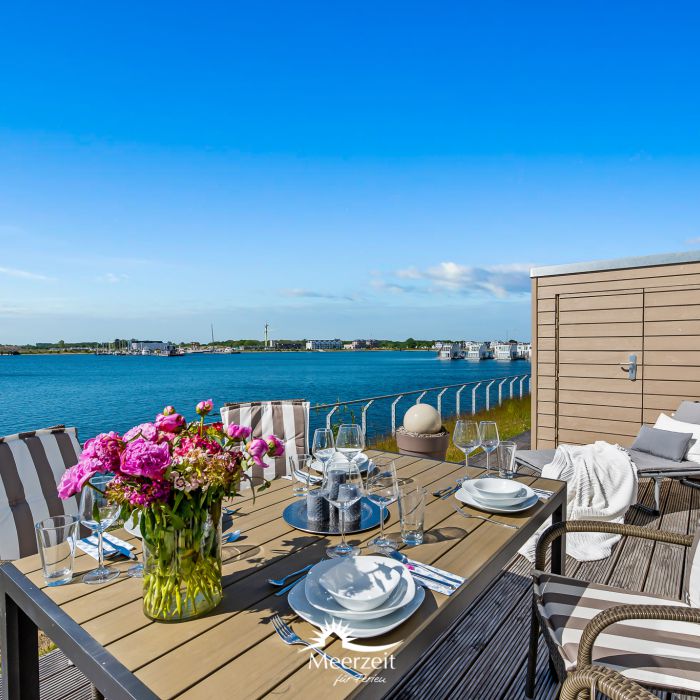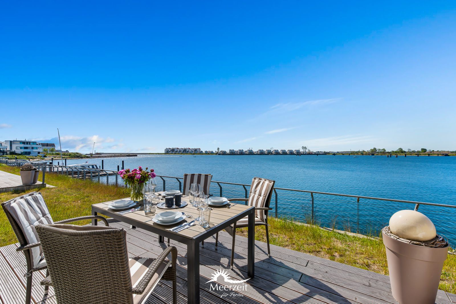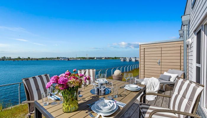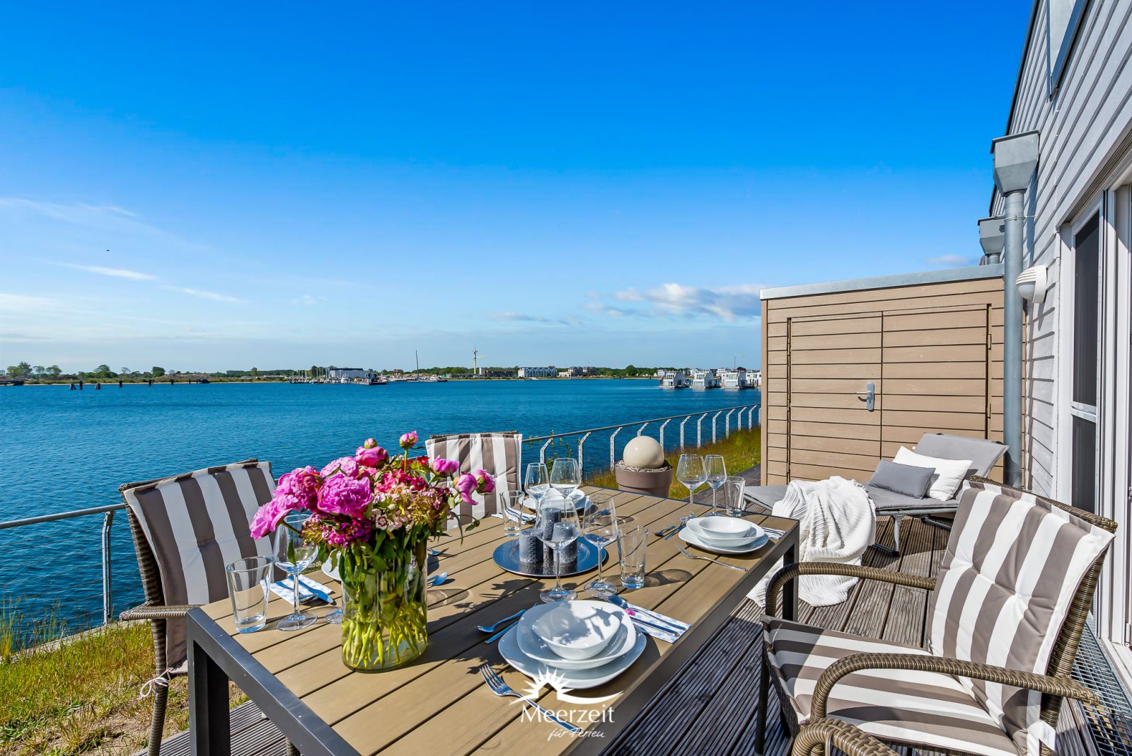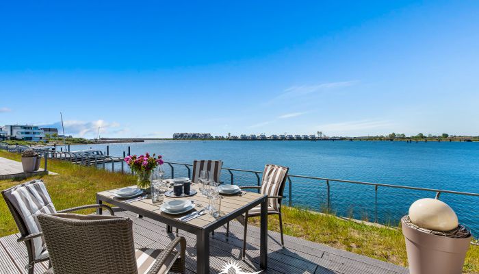 Die große, nach Süden ausgerichtete Terrasse grenzt direkt an das Wasser und bietet einen herrlichen Blick auf das Treiben im Yachthafen. Die wunderschöne Badebucht im Ostseeresort Olpenitz ist nur wenige Gehminuten entfernt.