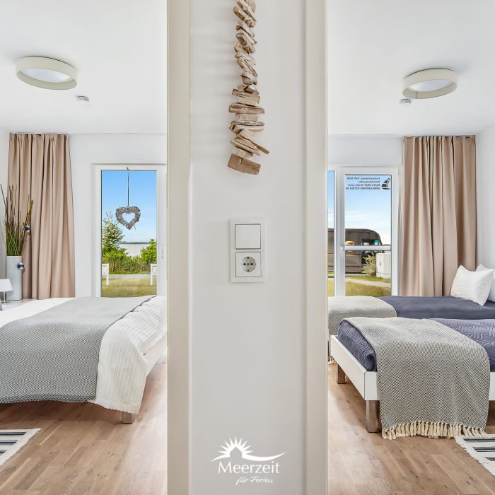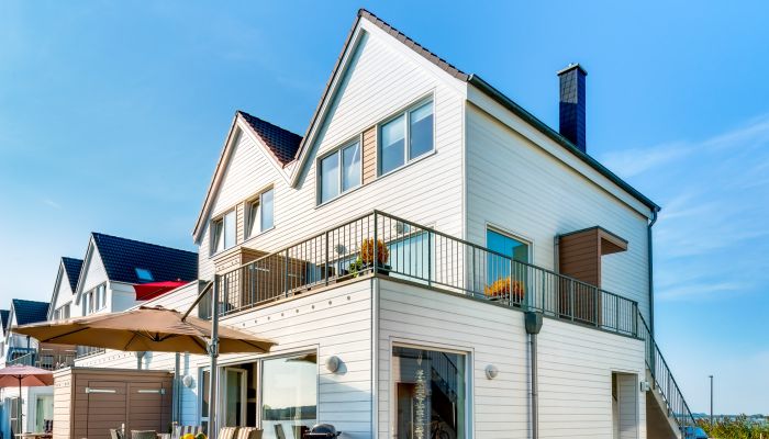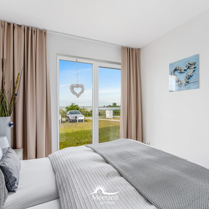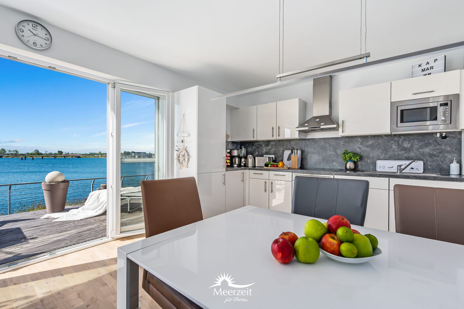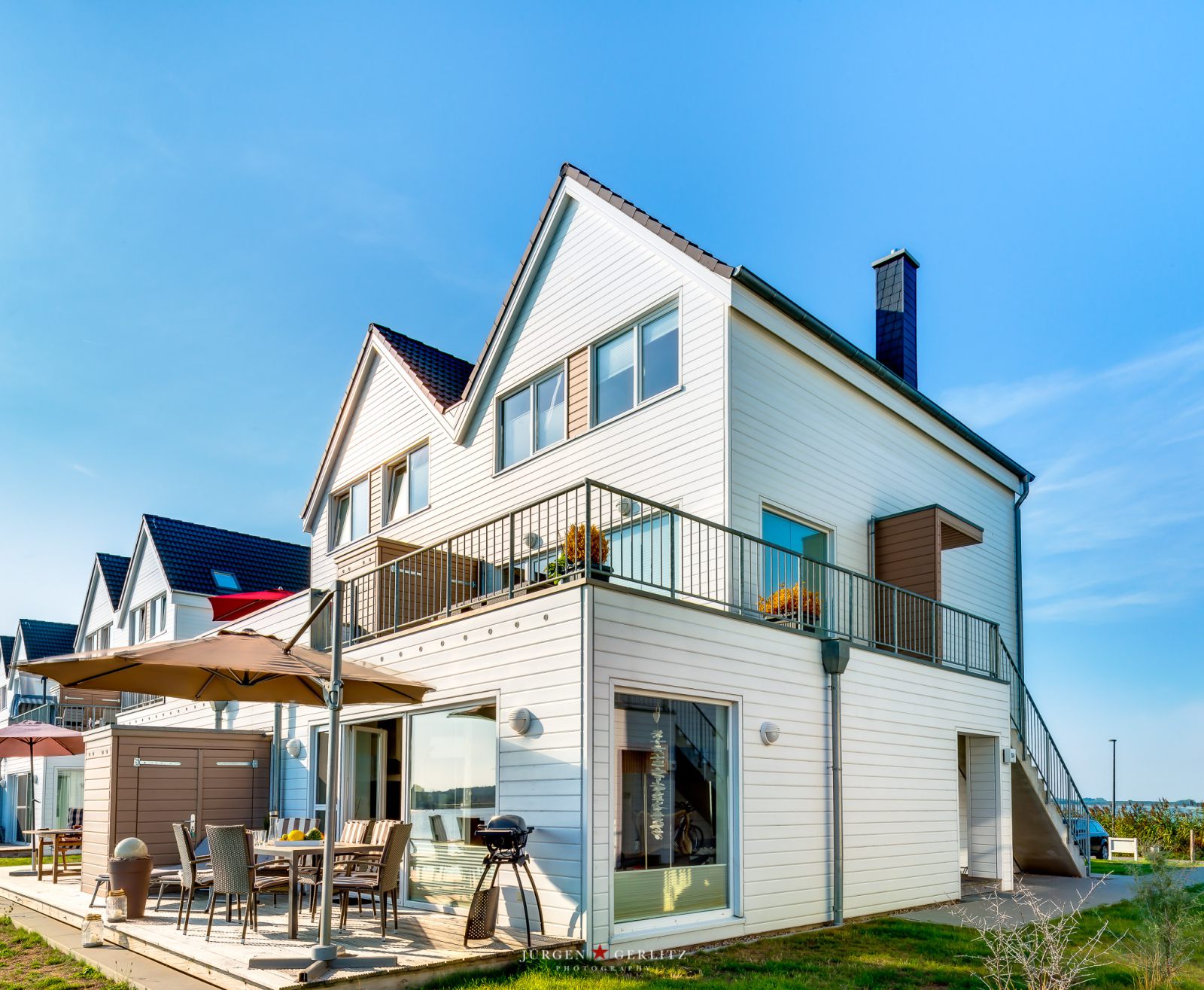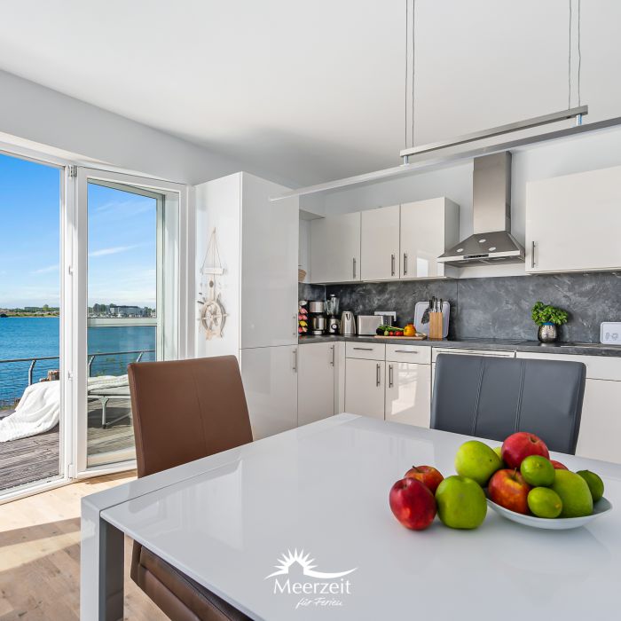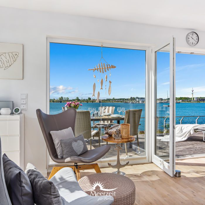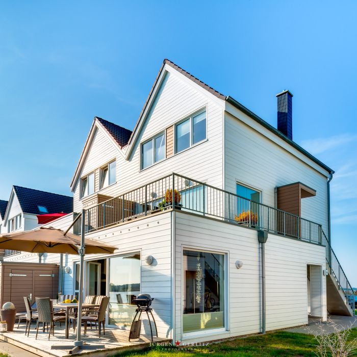 Die große, nach Süden ausgerichtete Terrasse grenzt direkt an das Wasser und bietet einen herrlichen Blick auf das Treiben im Yachthafen. Die wunderschöne Badebucht im Ostseeresort Olpenitz ist nur wenige Gehminuten entfernt.