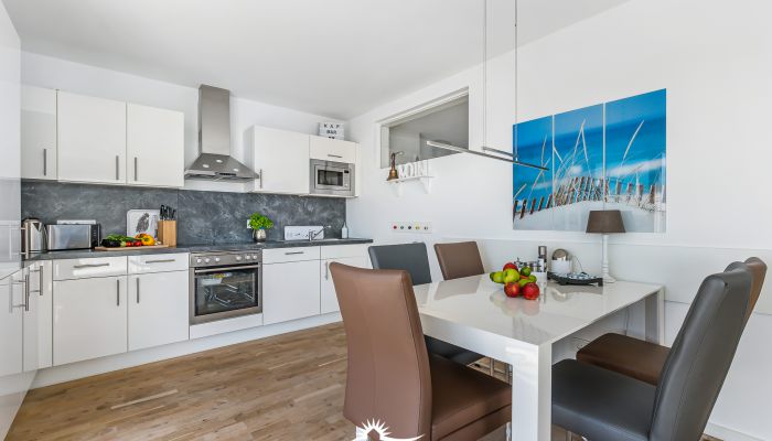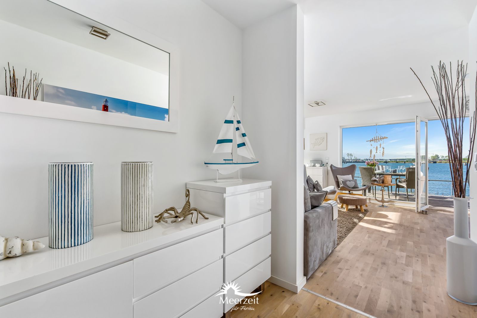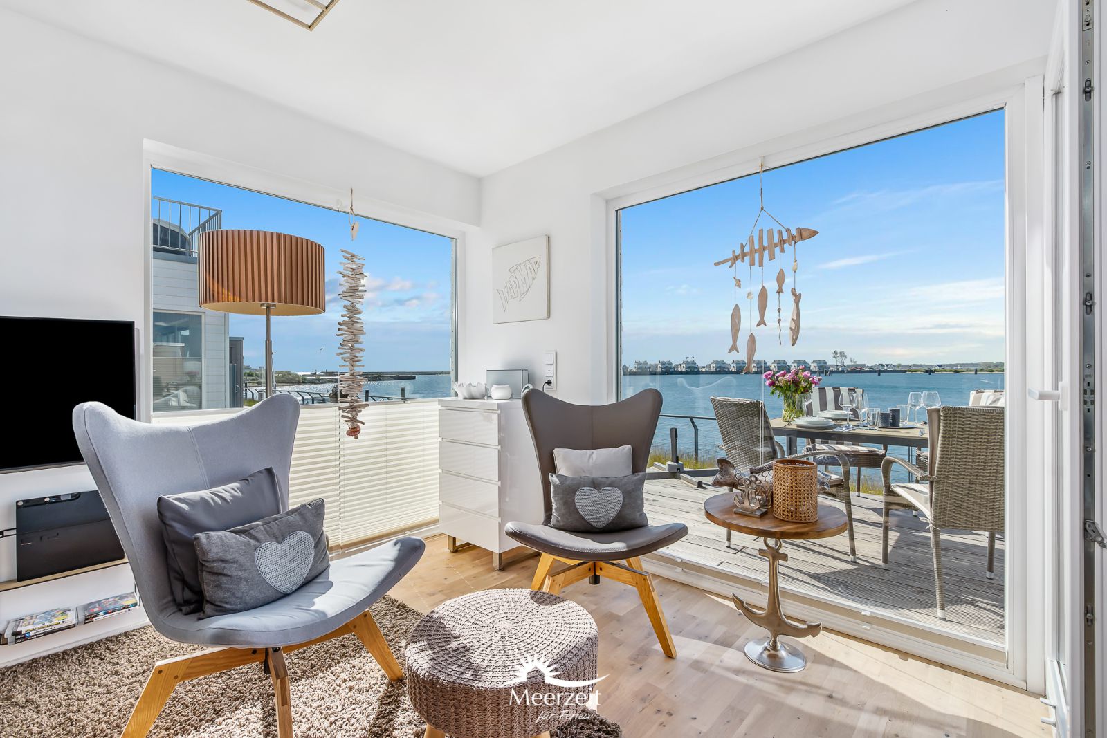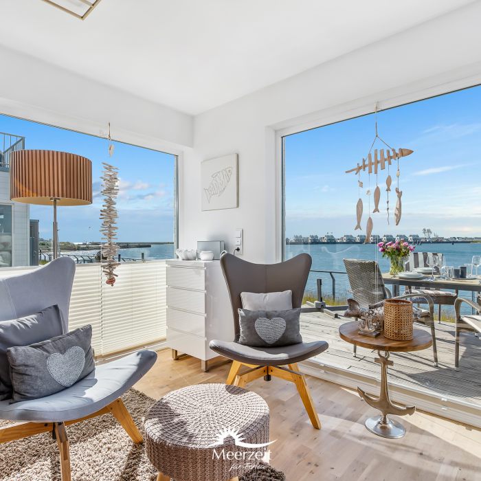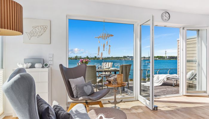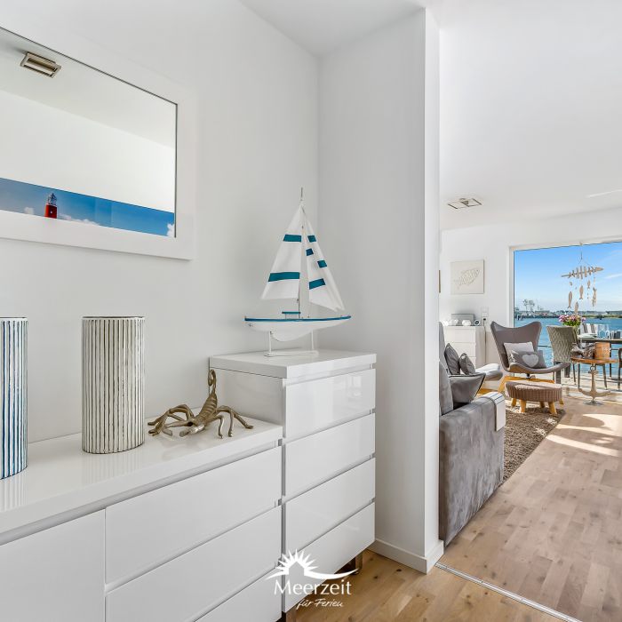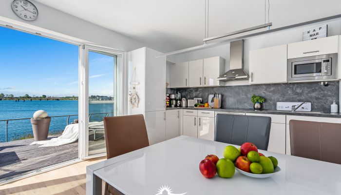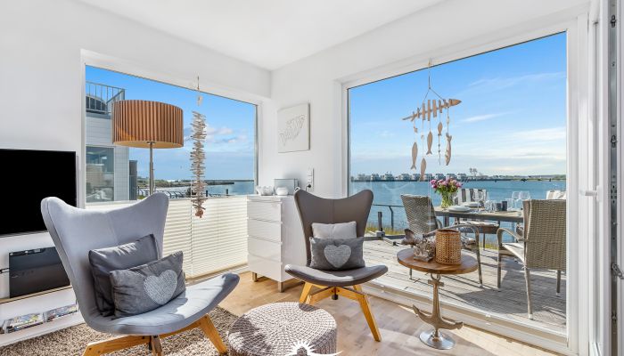 Das hochwertige Interieur im maritimen Design spiegelt die einzigartige Lage dieser Erdgeschosswohnung wieder. Das gesamte Inventar und das Mobiliar sind im Kaufpreis enthalten.