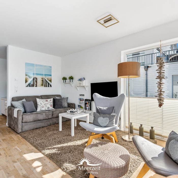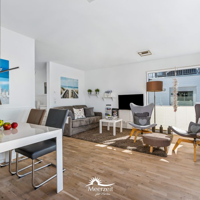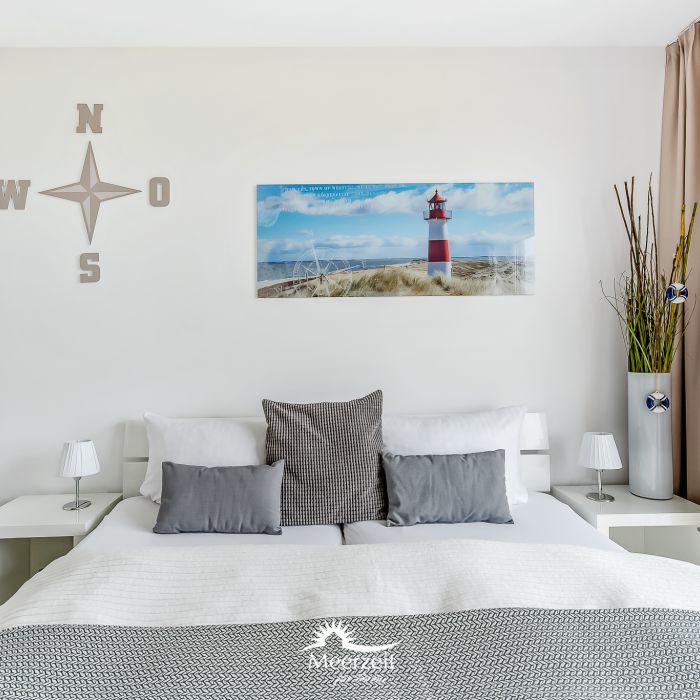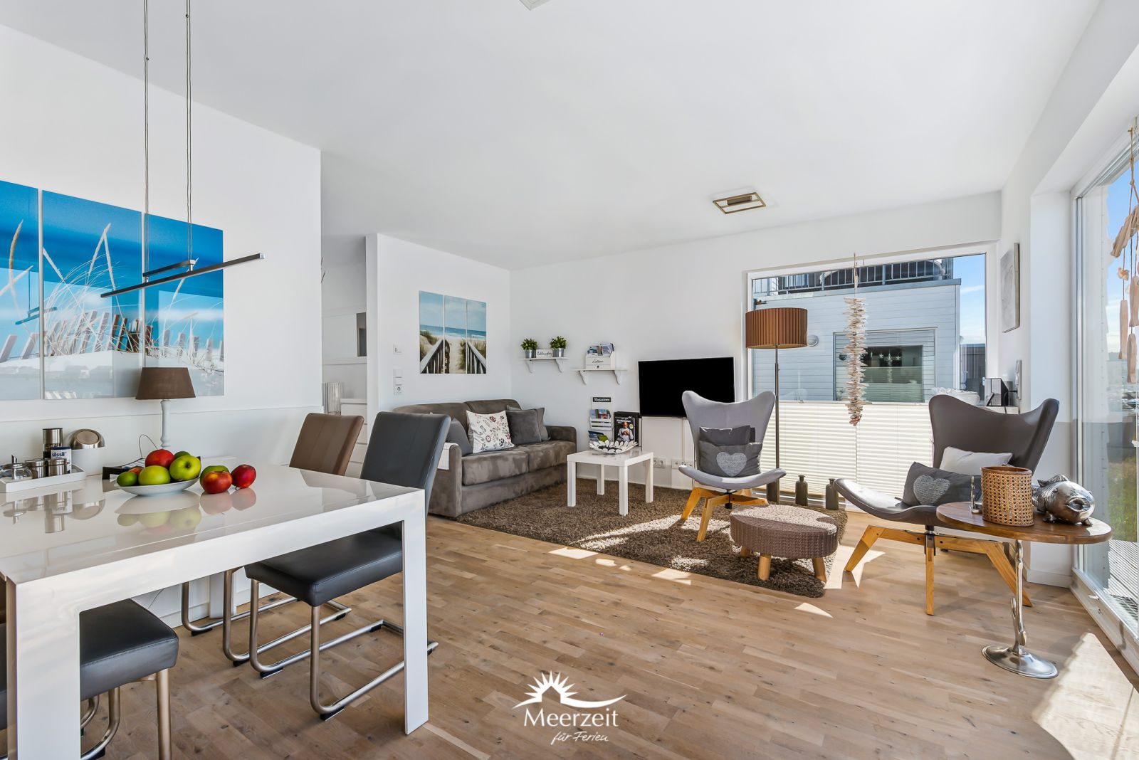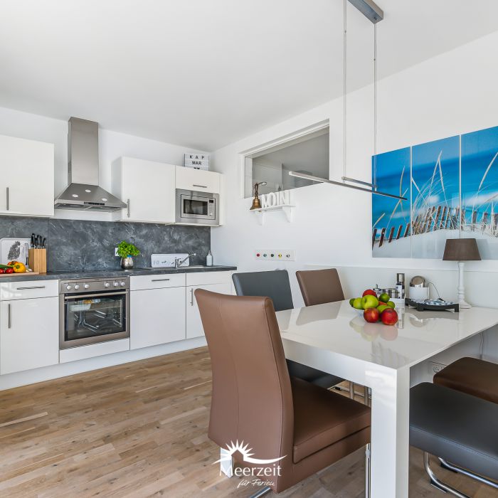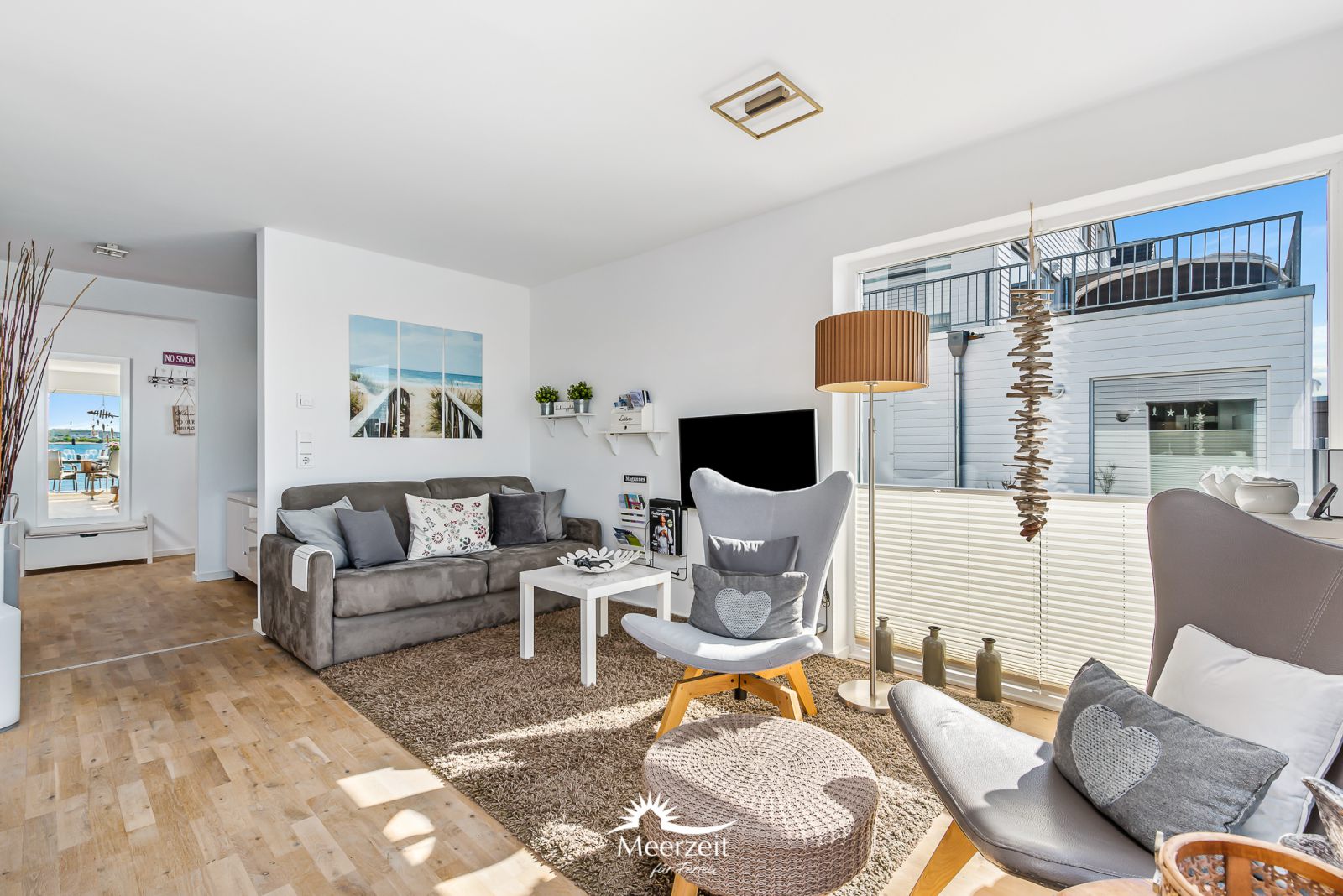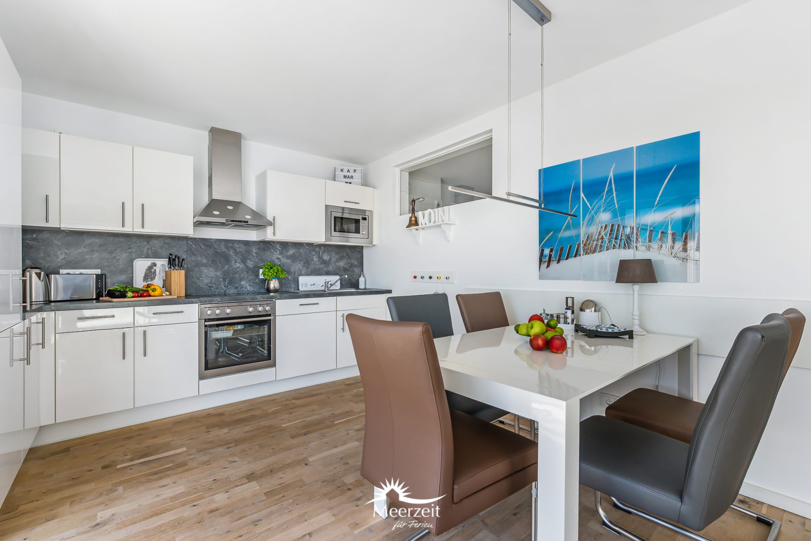 Das hochwertige Interieur im maritimen Design spiegelt die einzigartige Lage dieser Erdgeschosswohnung wieder. Das gesamte Inventar und das Mobiliar sind im Kaufpreis enthalten.